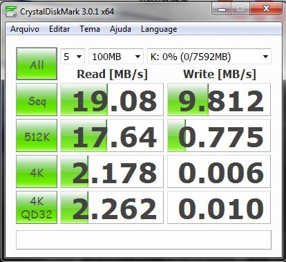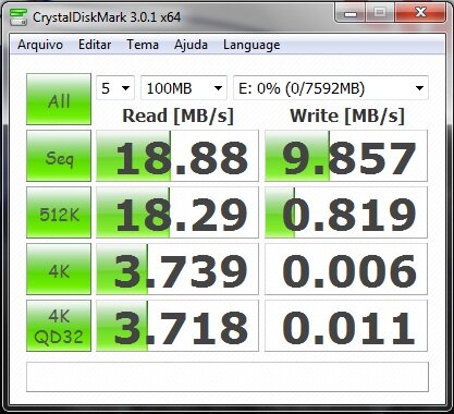 O primeiro teste foi efectuado recorrendo ao CristalDiskMark 3.0.1 onde foram obtidos os seguintes resultados: