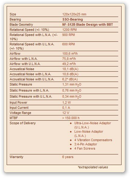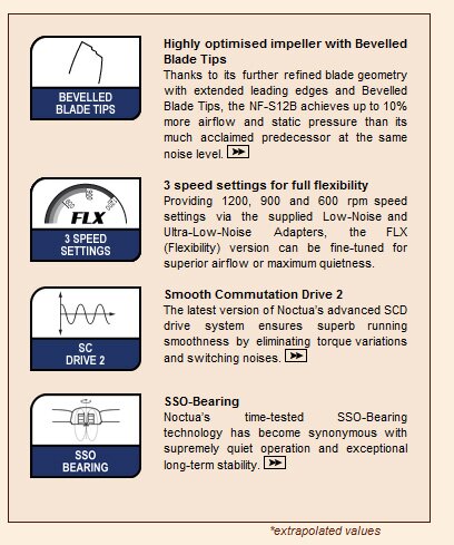 O Noctua NF-S12B destaca-se pela sua qualidade de construção e está preparado para oferecer o maior desempenho sem sacrificar o baixo ruído, é por esse motivo que usa um tipo de rolamentos especiais, os SSO que permitem que o ventilador produza apenas 18dB de ruído quando a funcionar a 1200Rpm.