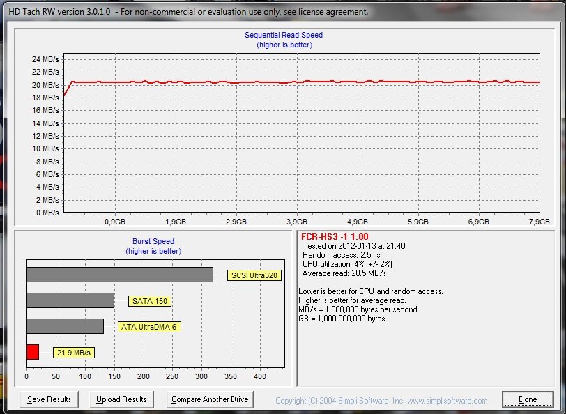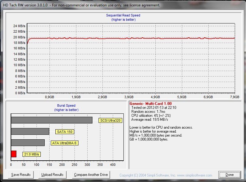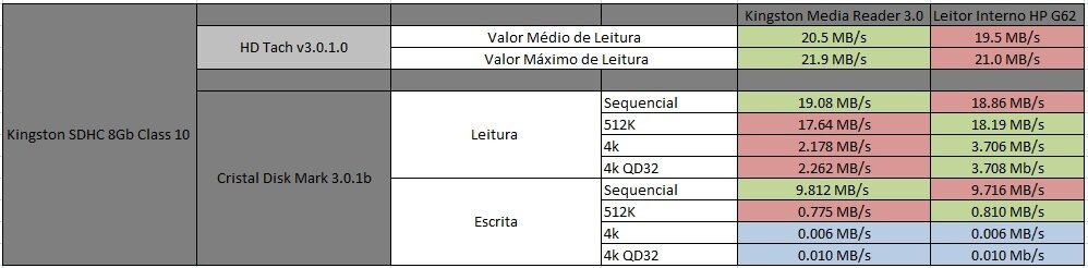 Ao avaliar os resultados obtidos no HD Tach RW 3.0.1.0 podemos constatar que o Kingston Media Reader USB 3.0 é mais rápido que o leitor de cartões de memória integrado no Hp G62 – A10EP.